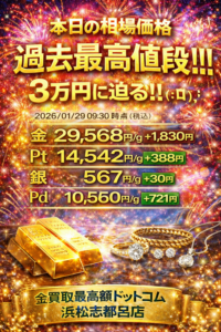 2026年1月29日 9:30時点の最新相場にて、金(K24)が1gあたり29,568円を記録しました。 前日比 +1,830円 と大幅上昇し、ついに「3万円/g」に迫る歴史的水準となっています。 ここまでの高値は非常に […]