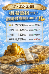 この3連休は金・プラチナ高価買取の大チャンスです! いつもご利用ありがとうございます。金買取最高額ドットコム浜松志都呂店です。 21日・22日・23日の相場価格が発表されました!現在、金・プラチナともに高水準を維持してお […]