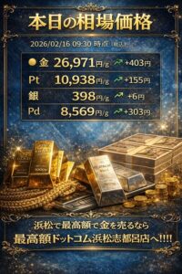 2026年1月16日 9:30時点の貴金属相場(税込)をご案内いたします。 多少の上下はあるものの、金相場は依然として高値水準を維持しています。特に今週末、土曜日・日曜日は「売り時」を狙うお客様が非常に多い状況です。 ◆ […]